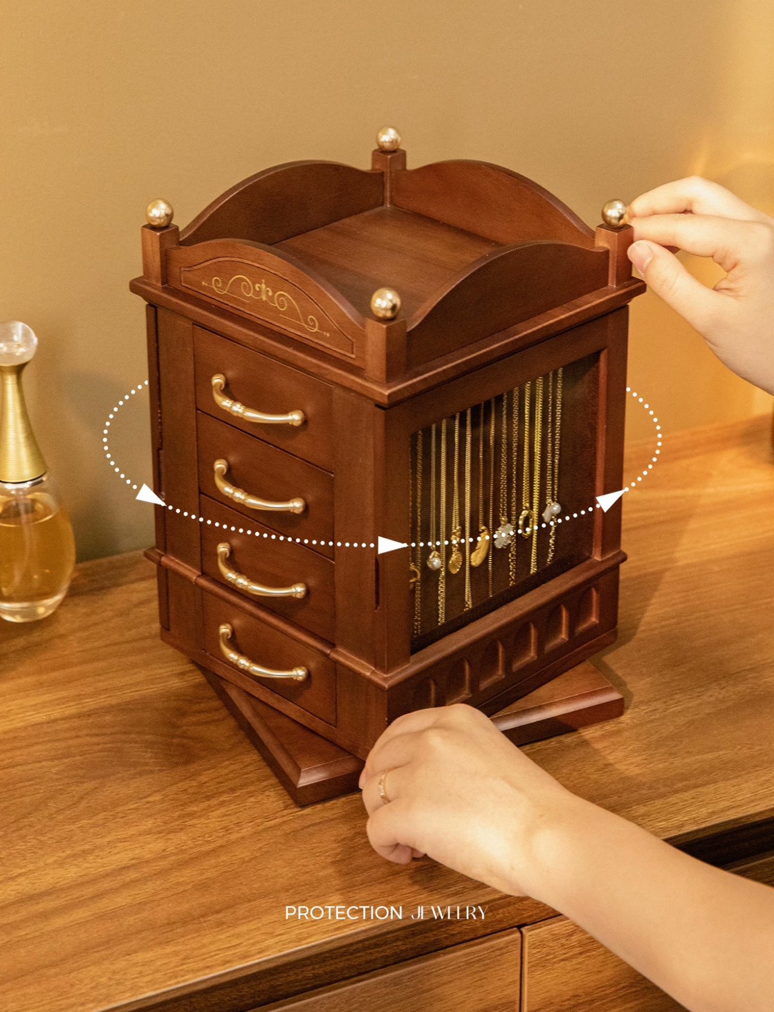 ✨ตู้เก็บเครื่องประดับ Regalia ดีไซน์คลาสสิกหรู โทนไม้สีน้ำตาลอบอุ่น ช่วยจัดเก็บเครื่องประดับได้อย่างเป็นระเบียบในตู้เดียว ตัวตู้สามารถหมุนได้รอบ 360 องศา เพิ่มความสะดวกในการใช้งาน มาพร้อมลิ้นชักหลายชั้น ช่องแขวนสร้อย และพื้นที่เก็บแหวน ต่างหู และเครื่องประดับหลากหลายประเภท เหมาะสำหรับตั้งบนโต๊ะเครื่องแป้งหรือใช้เป็นของตกแต่งบ้านที่ช่วยเพิ่มความหรูหราให้กับพื้นที่